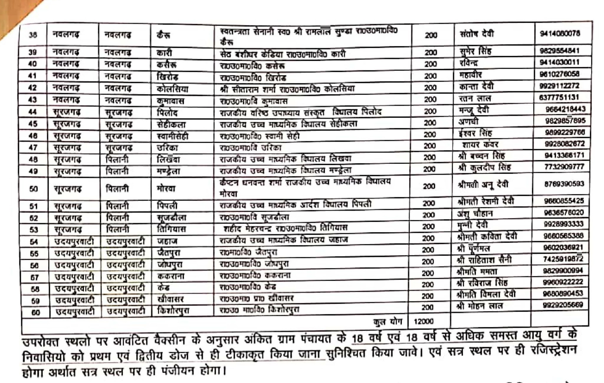 जिले के ग्रामीण क्षेत्रों में 60 जगहों पर वैक्सीनेशन शिविर आयोजित होंगे। गुरूवार को ग्राम पंचायत लादूसर, लूणा, लूट्टू, मलसीसर, नान्द, लालामण्डी, लाम्बी अहीर, पचेरी कलां, पांथरोली, रायपुर अहीरान, पुहानियां, सांवलोद, साहपुर, श्यामपुरा, सिलारपुरी, सारी, सोलाना, श्योपुरा, सुलताना, देरवाला, ढाणी पुरोहितों की, नयासर, पातूसरी, प्रतापपुरा, सिगड़ा, शेखसर, सिरियासर कलां, टांई, फुसकानी, लोयल, माधोगढ़, मांदरी, मानोता जाटान, मानोता कलां, मेहाड़ा जाटूवास, नालपुर, झाझड़, कैरू, कारी, कसेरू, खिरोड़, कोलसिया, कुमावास, पिलोद, सेहीकलां, स्वामी सेही, उरीका, लिखवा, मंडे्रला, मोरवा, पीपली, सूजडौला, तिगियास, जहाज, जैतपुरा, जोधपुरा, ककराना, केड, खीवासर, किशोरपुरा में शिविर आयोजित होंगे। ग्रामीण क्षेत्र के वैक्सीनेशन स्थल पर ही रजिस्टे्रशन किया जाएगा।
