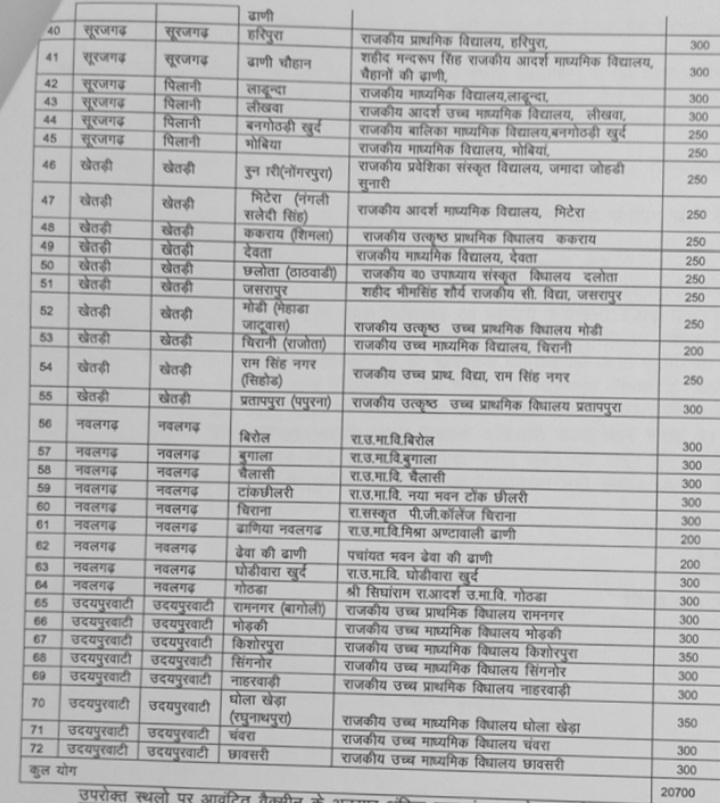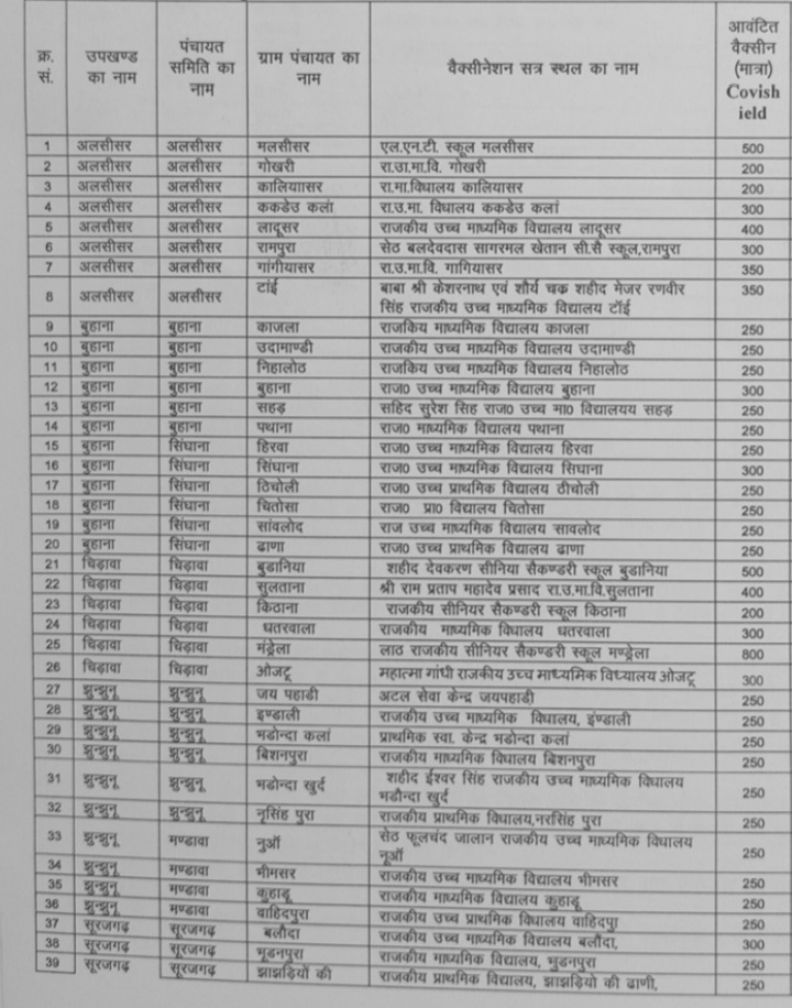 झुंझुनूं, कोरोना वायरस के संक्रमण की रोकथाम के तहत 18 वर्ष एवं 18 वर्ष से अधिक समस्त आयु वर्ग के व्यक्तियों को कोविड टीकाकरण से लाभान्वित किया जा रहा है। वर्तमान में जिले को आवंटित वैक्सीन डोज समस्त आयुवर्ग के व्यक्तियों को प्रथम एवं द्वितीय डोज से लाभान्वित करने के लिए 20 अगस्त को सुबह 9 बजे से शाम 5 बजे तक कोविशिल्ड वैक्सीनेशन के लिए चिन्हित किया जाता है। जिला कलक्टर उमरदीन खान ने बताया कि मलसीसर, गोखरी, कालियाासर, ककडेउ कलां, लादूसर, रामपुरा, गांगीयासर, टांई, काजला, उदामाण्डी, निहालोठ, बुहाना, सहड, पथाना, हिरवा, सिंघाना, ठिचोली, चितोसा, सांवलोद, ढाणा, बुडानिया, सुलताना, किठाना, धतरवाला, मंड्रेला, ओजटू, जय पहाडी, इण्डाली, भडोन्दा कलां, बिशनपुरा, भडोन्दा खुर्द, नृसिंहपुरा, नुऑ, भीमसर, कुहाडू, वाहिदपुरा,बलौदा, भूडनपुरा, झाझड़ियों की ढाणी, हरिपुरा,ढाणी चौहान, लाडून्दा, लीखवा, बनगोठड़ी खुर्द, भोबिया, सुनारी (नोंगरपुरा), भिटेरा(नंगली सलेदी सिंह), ककराय (शिमला), देवता, छलोता (ठाठवाडी), जसरापुर, मोडी (मेहाडा जाटूवास), चिरानी (राजोता), राम सिंह, नगर (सिहोड), प्रतापपुरा (पपुरना), बिरोल, बुगाला, चैलासी, टांकछीलरी, चिराना, ढाणिया नवलगढ, ढेवा की ढाणी, घोडीवारा खुर्द, गोठडा, रामनगर (बागोली), भोड़की, किशोरपुरा, सिंगनोर, नाहरवाड़ी, धोला खेड़ा (रघुनाथपुरा), चंवरा, छावसरी में कोविशिल्ड की पहली और दूसरी डोज लगाई जाएगी।