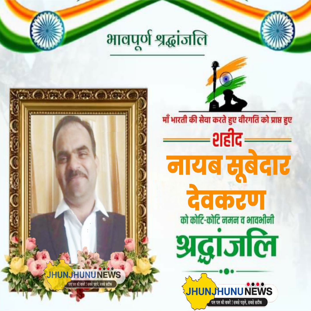 सियाचिन ग्लेशियर में ड्यूटी के दौरान झुंझुनूं का एक ओर जवान शहीद हो गया। नायब सूबेदार देवकरण आर्मी की 15 वीं जाट रेजीमेंट यूनिट में तैनात थे। 13 फरवरी को डयूटी के दौरान अचानक तबीयत खराब हो गई थी। उसके बाद देवकरण को मिलीट्री अस्पताल में भर्ती करवाया गया था। जहा उनका इलाज चल रहा था। इलाज के दौरान रविवार को देवकरण ने देश की रक्षा करते हुए प्राण गवा दिए।