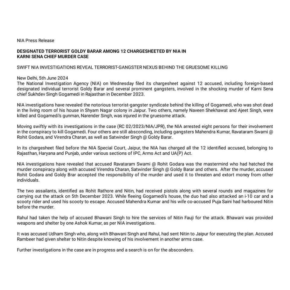 सुखदेव सिंह गोगामेड़ी हत्याकांड में NIA ने गोल्डी बराड़, रोहित गोदारा सहित 12 लोगों के खिलाफ चार्जशीट दाखिल की।