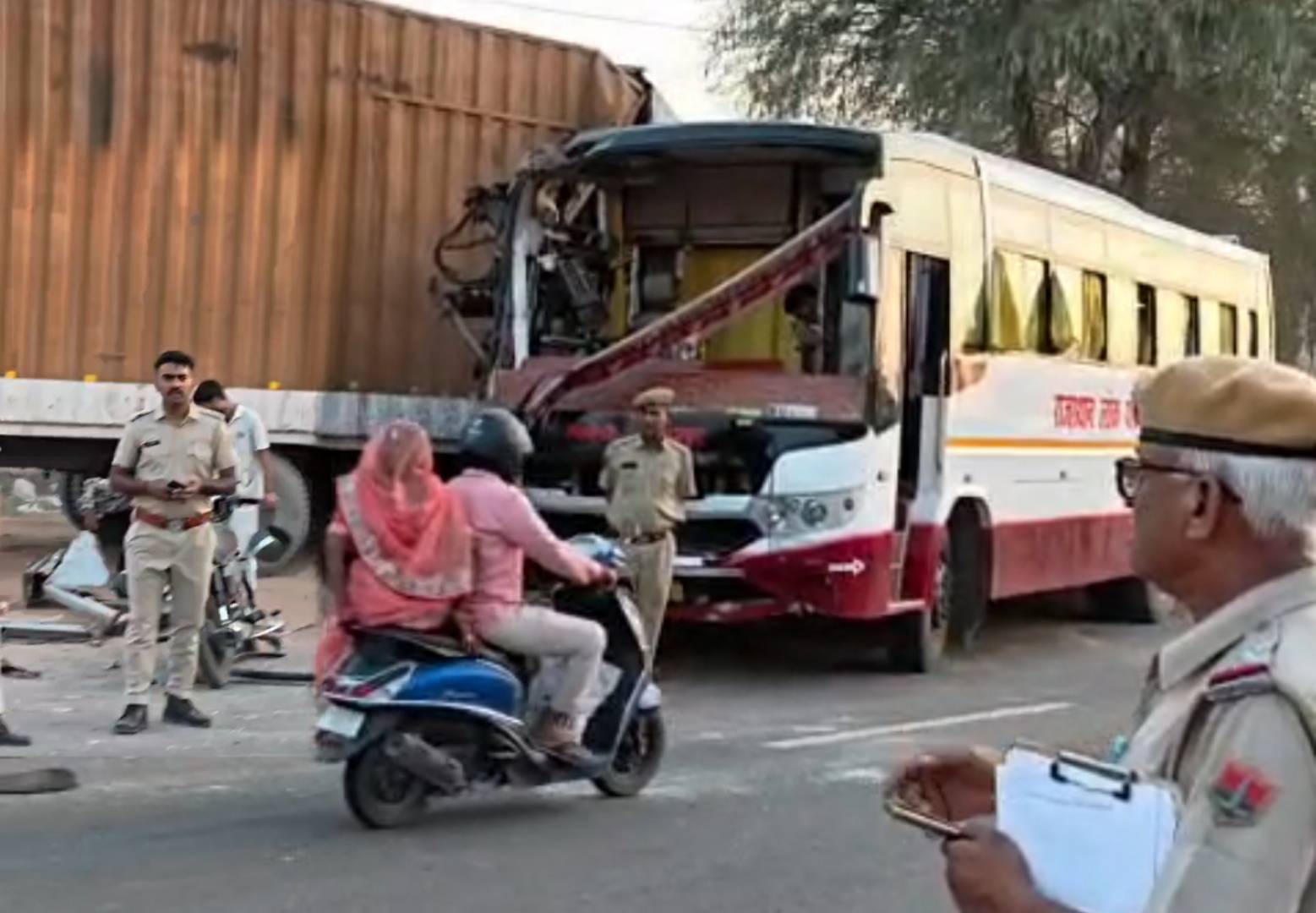 लोक परिवहन बस ने कंटेनर को मारी टक्कर, बाइक सवार कुचला, एक जयपुर रैफर
