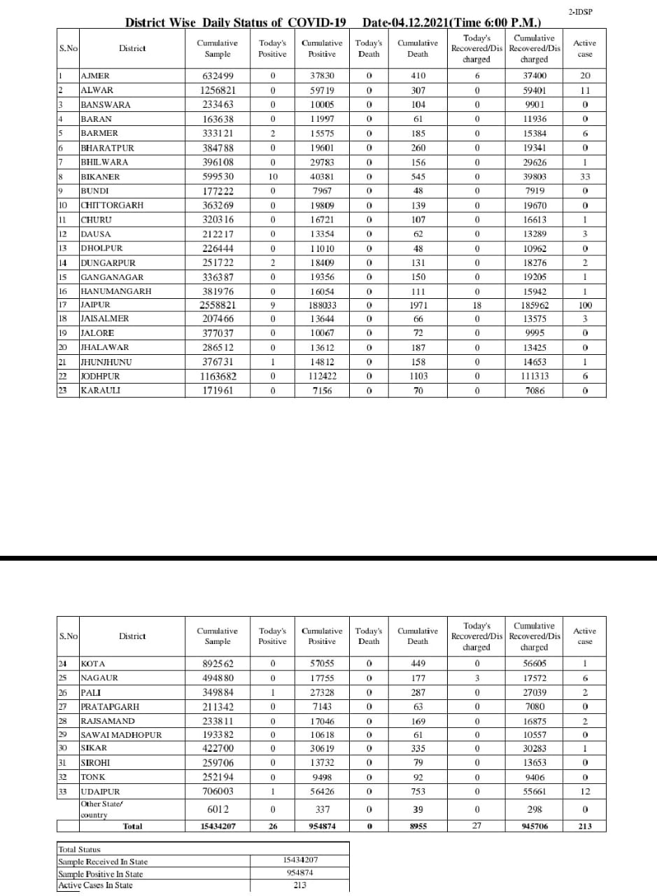 राजस्थान: प्रदेश में 04 दिसंबर 2021 शाम 06 बजे तक की कोरोना रिपोर्ट।