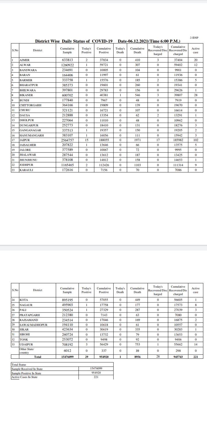 राजस्थान: प्रदेश में 06 दिसंबर 2021 शाम 06 बजे तक की कोरोना रिपोर्ट।