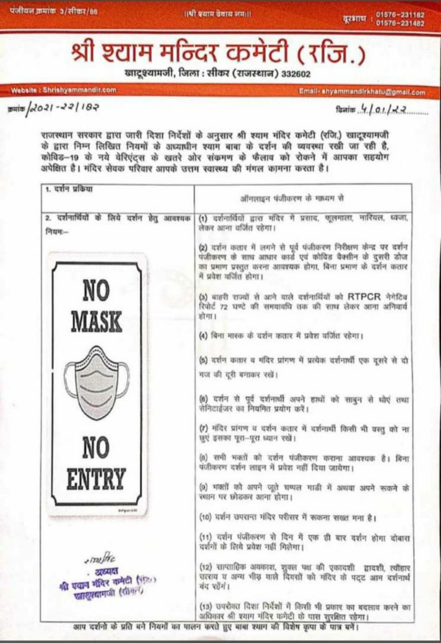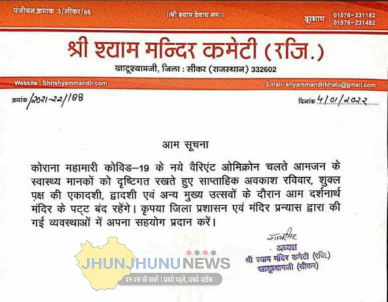 कोरोना के नए वेरिएंट ओमीक्रोन के चलते खाटू श्याम मंदिर ने लिया महत्वपूर्ण निर्णय Jhunjhunu News 04/01/2022 by Jhunjhunu News कोरोना के नए वेरिएंट ओमीक्रोन के चलते आमजन के स्वास्थ्य को देखते हुए श्री श्याम मंदिर कमेटी, खाटूश्याम ने निर्णय लिया है किसाप्ताहिक अवकाश रविवार शुक्ल पक्ष की एकादशी, द्वादशी एवं अन्य मुख्य उत्सव के दौरान आम दर्शनार्थ मंदिर के पट्ट बंद रहेंगे WhatsApp Group Join Now Telegram Join Join Now