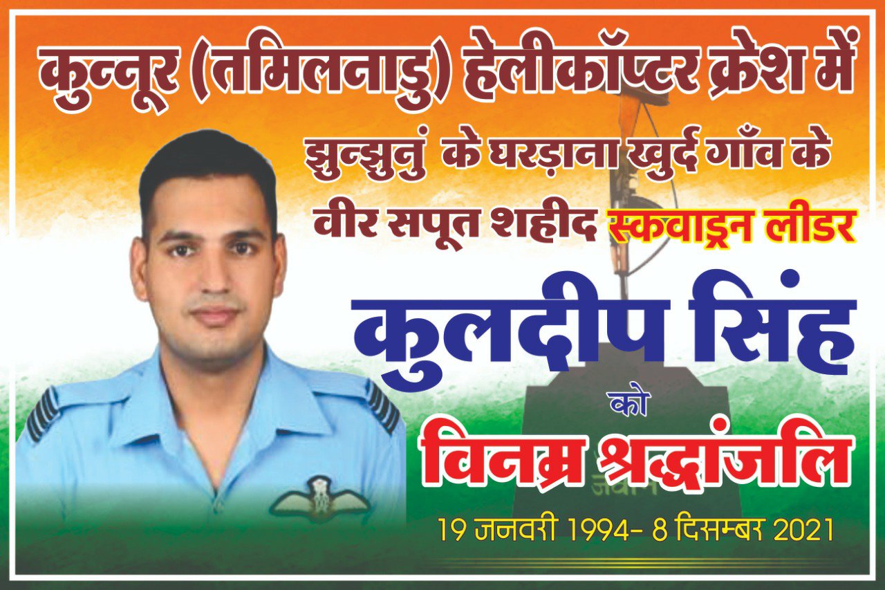हेलीकॉप्टर हादसे में सीडीएस बिपिन रावत के साथ शहीद होने वाले स्क्वाड्रन लीडर कुलदीप सिंह की पार्थिव देह झुंझुनूं हवाई पट्टी पर हेलीकॉप्टर से शनिवार को सुबह 11:40 पर पहुंचेगी।