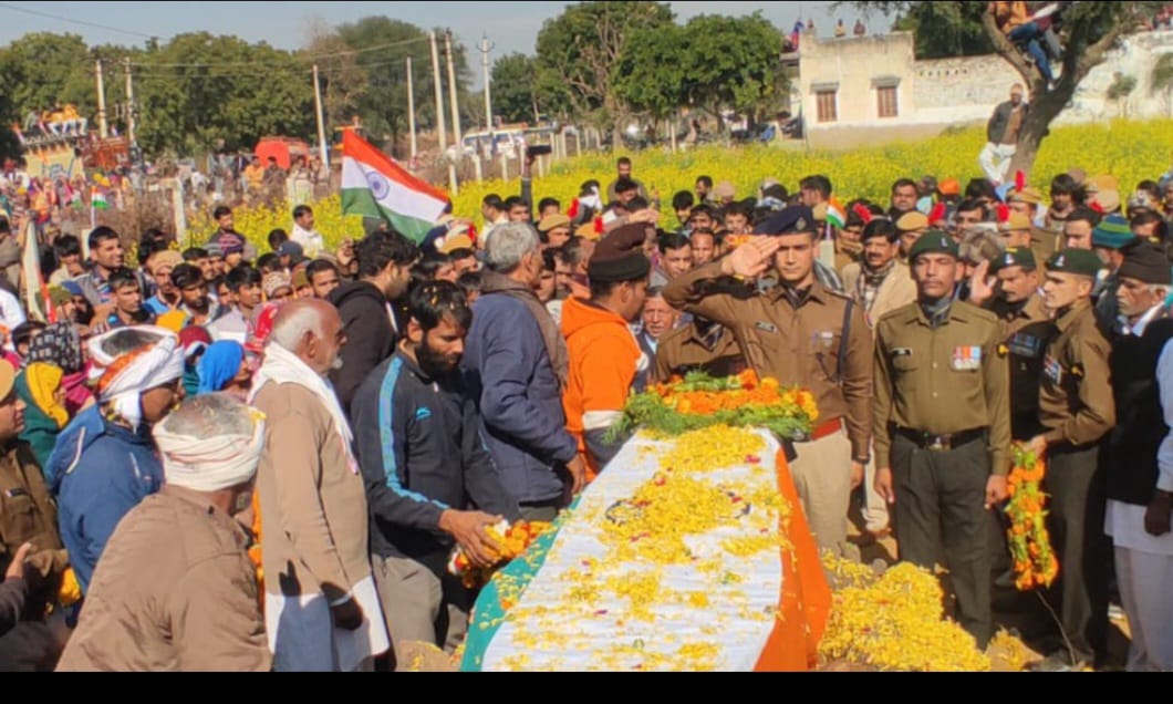 झुंझुनूं,25 दिसंबर। सिक्किम के जेमा में 23 दिसंबर को हुए आर्मी ट्रक हादसे में झुंझुनूं के बुहाना उपखंड के माजरी गांव के शहीद मनोज कुमार की रविवार को राजकीय सम्मान के साथ अंत्येष्टि की गई। शहीद के बड़े भाई प्रमोद कुमार ने शहीद की चिता को मुखाग्नि दी। पचेरी से शहीद मनोज कुमार की पार्थिव देह तिरंगा यात्रा के साथ रवाना हुई। पचेरी से माजरी तक तिरंगा यात्रा में बड़ी संख्या में युवा और आसपास के ग्रामीण तथा जनप्रतिनिधि शामिल हुए।