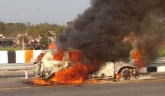 चलती कार में लगी आग, गाड़ी पूरी जलकर हुई खाक