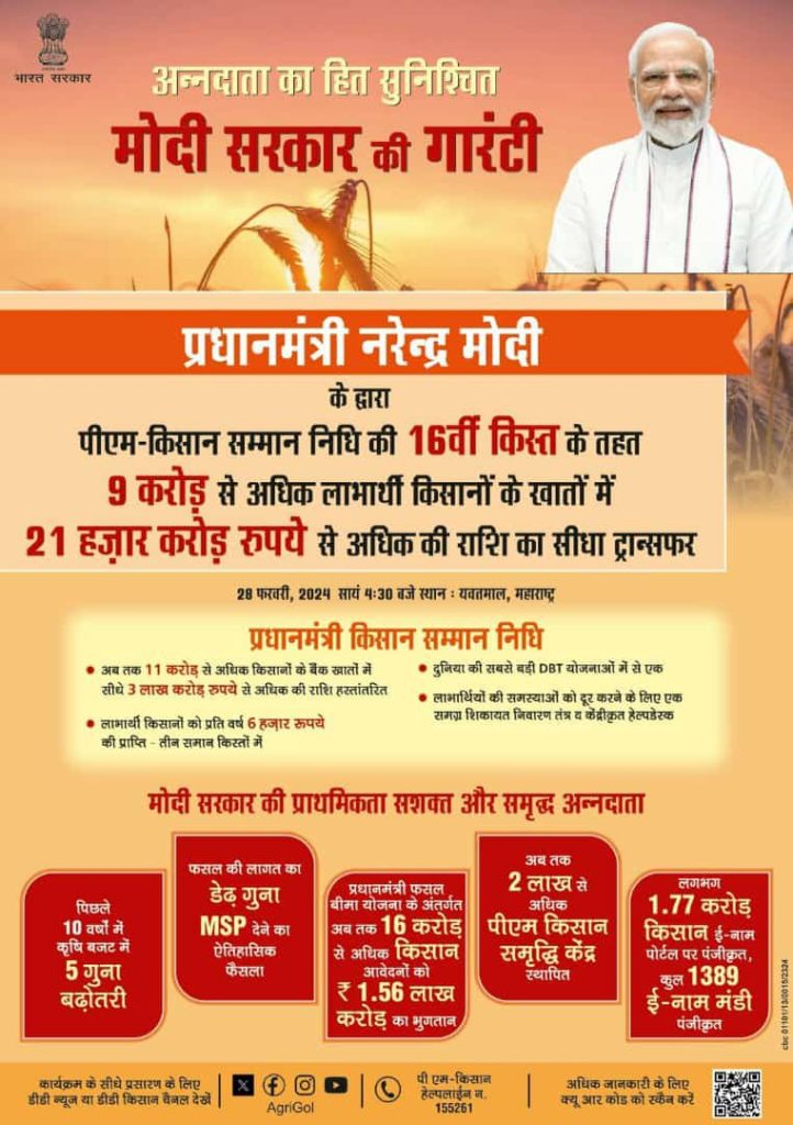योजना के अनुसार, यह हर चार महीने में एक बार जारी की जाती है। 15वीं किस्त नवंबर में जारी की जा चुकी है और पीएम किसान योजना की अगली किस्त का इंतजार कर रहे देशभर के करोड़ों किसानों के लिए बड़ी खुशखबरी सामने आई है. सरकार की तरफ से पीएम किसान योजना की 16वीं किस्त 28 फरवरी को जारी की गई । पीएम किसान सम्मान निधि की 16 वी किस्त के रूप मे देश के 9 करोड़ से अधिक लाभार्थी किसानों के खाते में सीधे 21 हजार करोड़ रुपए से अधिक की राशि भेजी गई ।