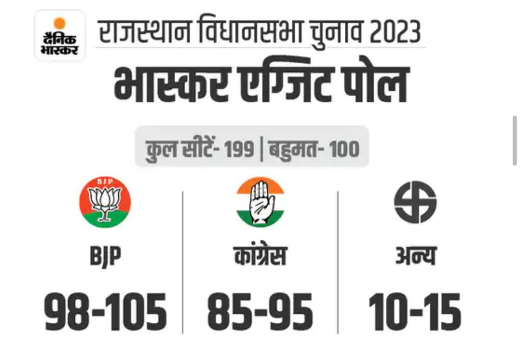 जन की बात के एग्जिट पोल में राजस्थान में भाजपा को 100-122, कांग्रेस को 62 से 85, अन्य को एक भी सीट नहीं दी गई है। राज्य में कुल 200 सीटें हैं। यहां सरकार बनाने के लिए 101 सीटों की जरूरत है।