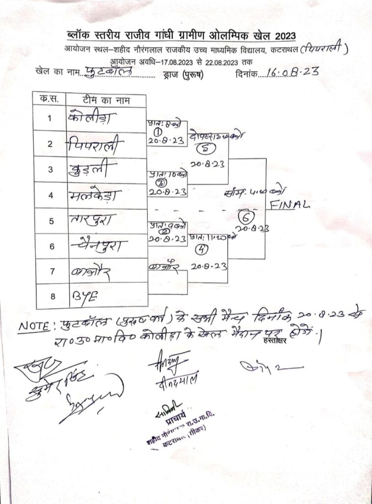 जय कौशिक उपखंड अधिकारी एवं प्रतियोगिता संयोजक की अध्यक्षता में बुधवार को राजकीय उच्च माध्यमिक विद्यालय कटराथल (पिपराली) में समीक्षा बैठक आयोजित कर तैयारियों को अंतिम रूप दिया गया। बैठक में सुमन चौधरी मुख्य ब्लॉक शिक्षा अधिकारी पिपराली, एसीबीईओ बलदेव सिंह बगड़िया, रामनारायण सिंह, ब्लॉक चिकित्सा अधिकारी डॉ. अजीत शर्मा, सीडीपीओ रमेश कुमार, बीएसओ भंवर सिंह, बीडीओ शिशुपाल सिंह, सहायक अभियंता रेखा जेवरिया, आयोजन समिति, खेलवार निर्णायक, स्कोरर,सहयोगी समिति,नियंत्रण कक्ष के प्रभारी अधिकारी , कार्मिकों ने भाग लिया।