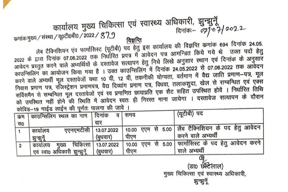 यूटीबी बेस पर निकाली गई फार्मासिस्ट और लेब टेक्नीशियन की काउंसलिंग व दस्तावेज सत्यापन 13 जुलाई को