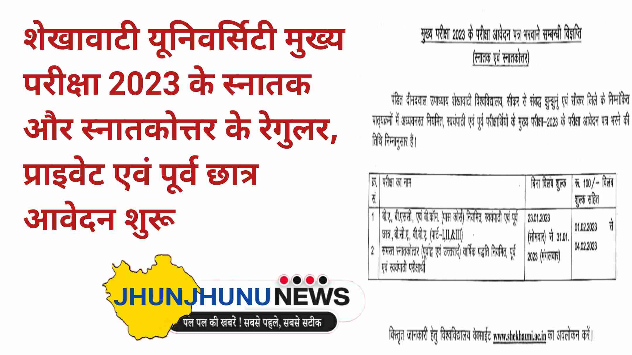 Shekhawati University main exam form 2023: काफी दिनों से इंतजार कर रहे शेखावाटी यूनिवर्सिटी के छात्रों का इंतजार आज खत्म हुआ शेखावटी यूनिवर्सिटी ने बीए, बीएससी, बिकॉम कक्षाओं का मुख्य परीक्षा का नोटिफिकेशन जारी कर दिया है।