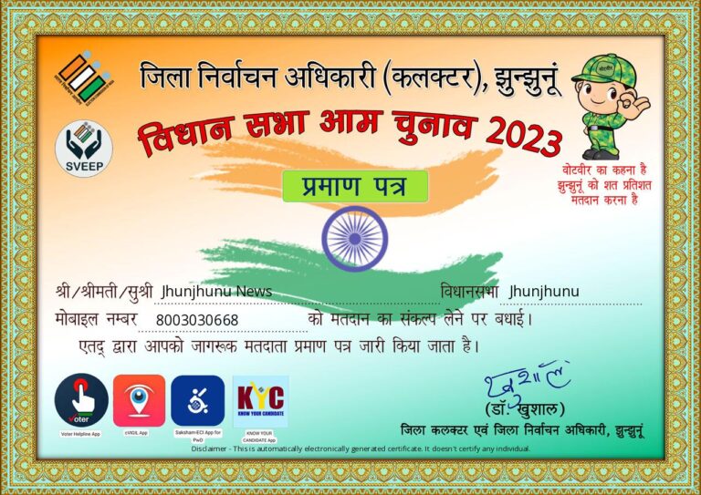 Jhunjhunu News विधानसभा चुनाव 2023:मतदान का संकल्प लेने वालों को मिलेगा ई- सर्टिफिकेट